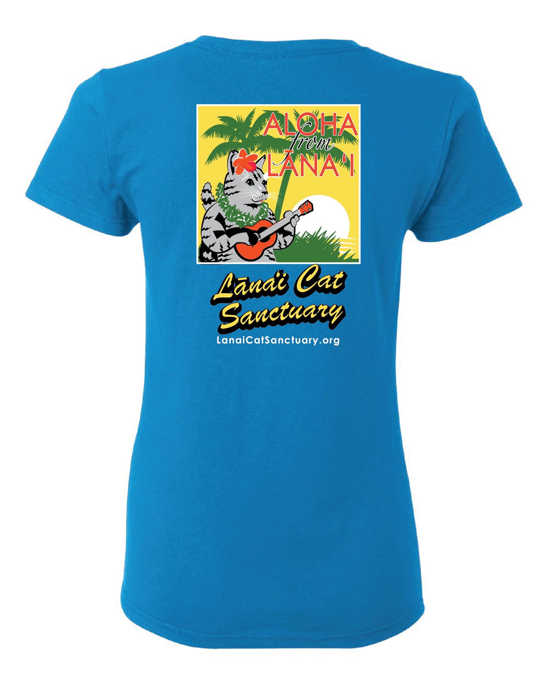 The Women’s Sapphire “Aloha from Lānaʻi” Ukulele Cat T-Shirt features our beloved ukulele-playing cat design, inspired by the rescued cats of Lānaʻi and the joy of island life.