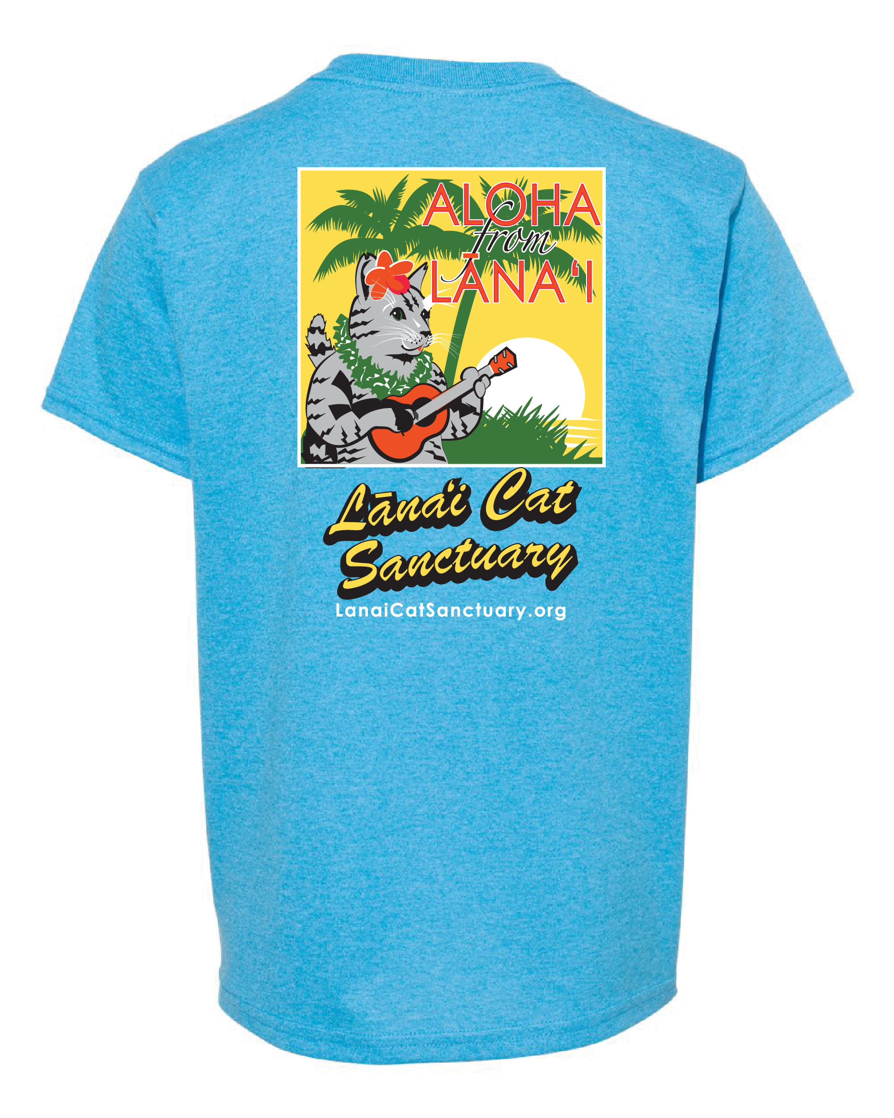 The Youth “Aloha from Lānaʻi” Ukulele Cat T-Shirt celebrates Hawaiʻi, music, and compassion for animals. It features a vibrant back graphic of our ukulele-playing sanctuary cat and a clean front logo for everyday wear.